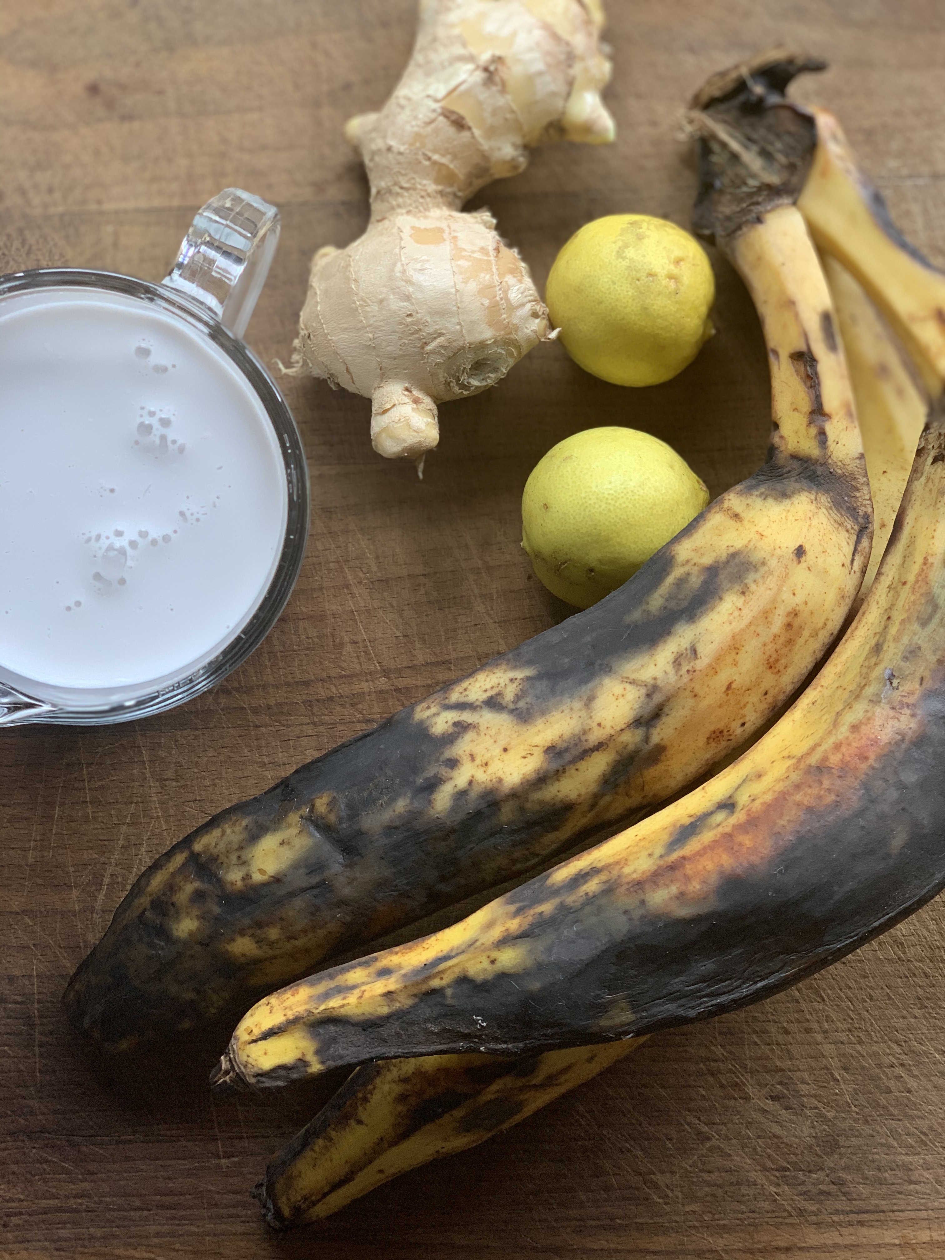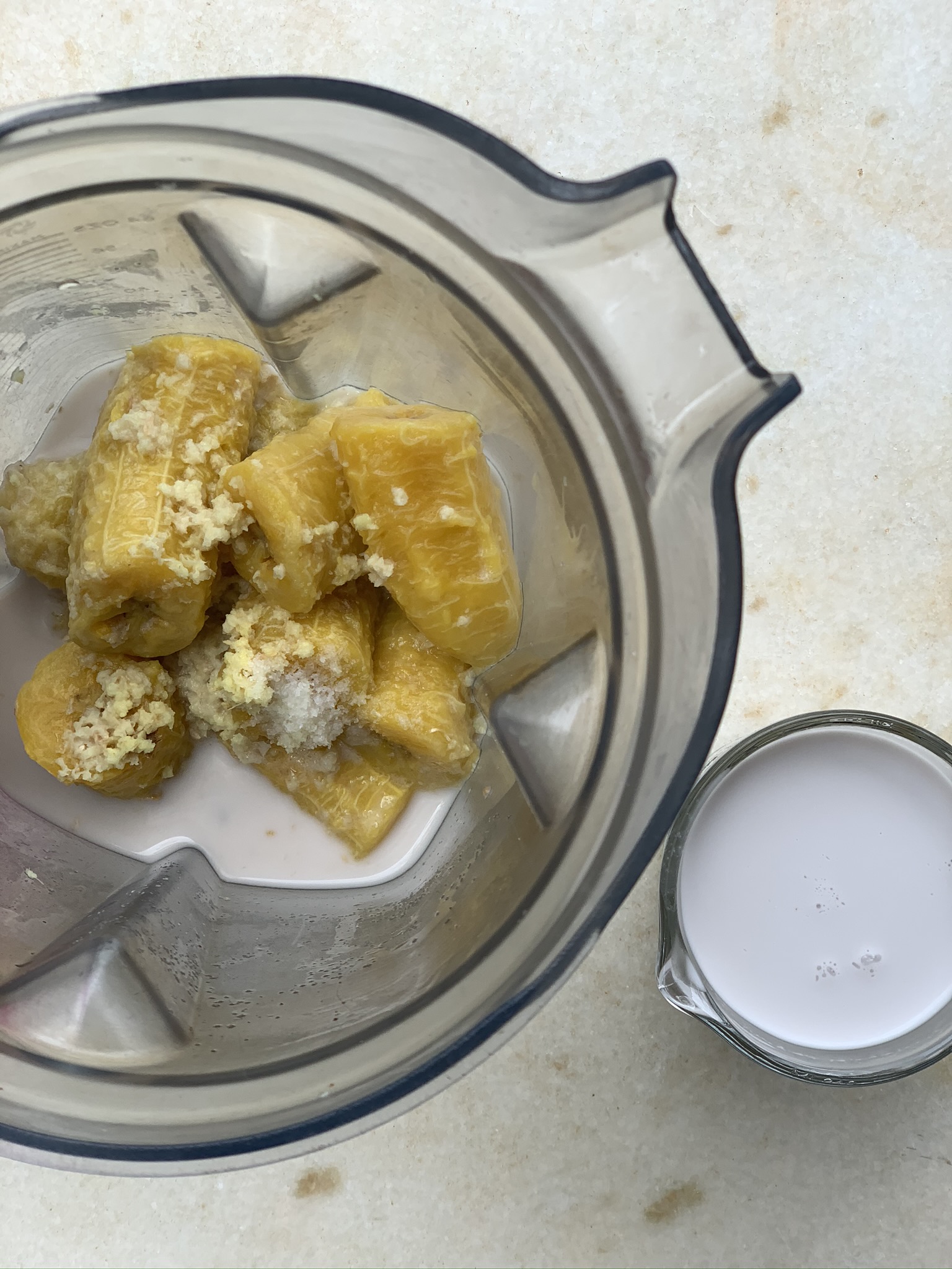 - No liquidificador, junte as bananas, um pouco do leite de coco, o gengibre e o sal. Prefiro adicionar o leite de coco aos poucos para chegar à textura de que eu gosto. Dependendo do tamanho das bananas e da textura de que mais gostar, às vezes, vai mais um pouco de leite de coco.