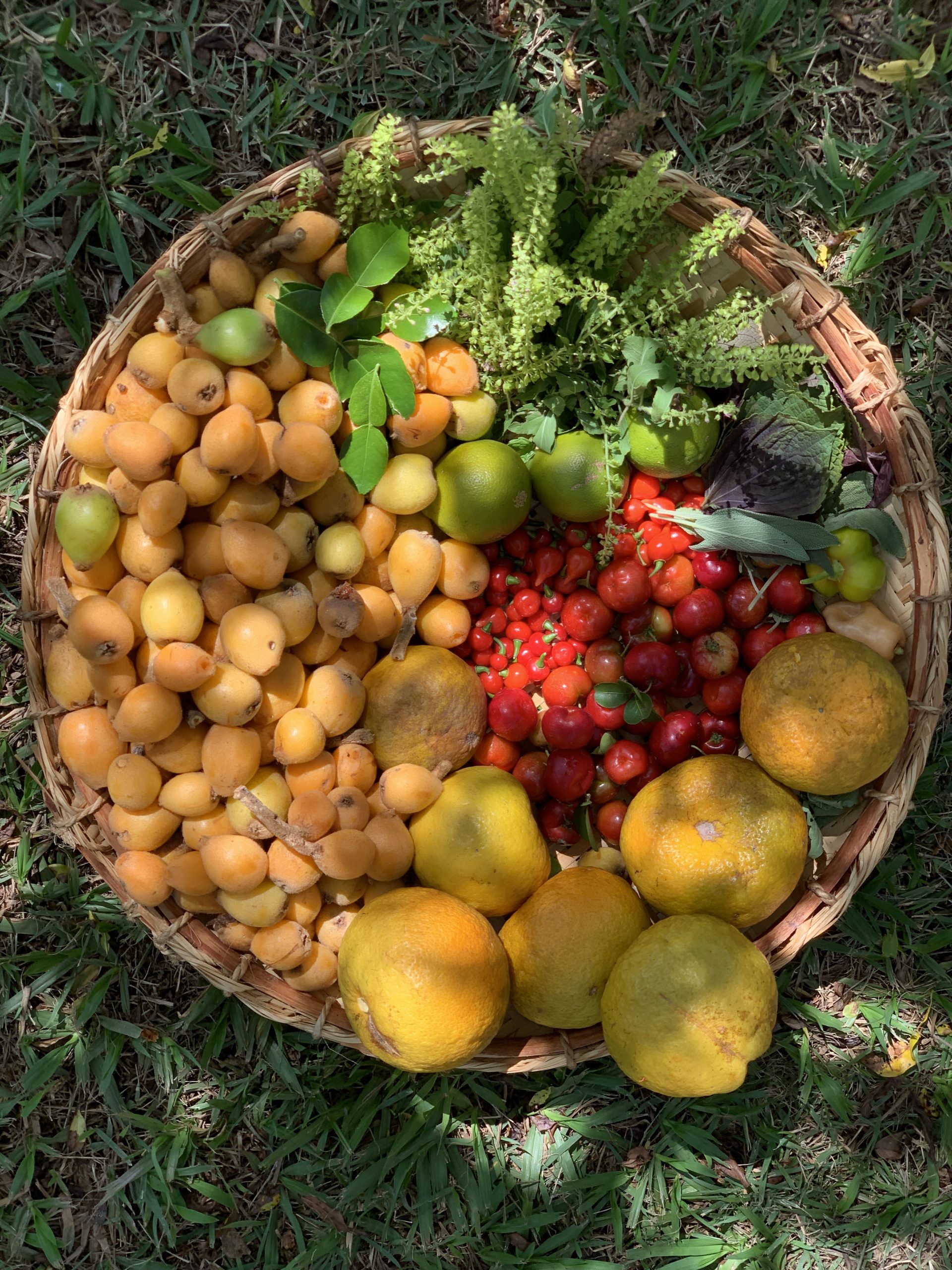A sorte é que conseguimos uma casa nova com um quintal enorme, riacho no fundo e algumas frutíferas. Temos jaca, romã, manga, goiaba, acerola, pitanga, graviola, banana, mexerica, carambola e até jabuticaba. E tem também uma área verde generosa para receber a nova horta, que, já, já vai começar. Há um mês voltei a semear, reformei todos os vasos que trouxe comigo, adubei as plantas que também sofreram com a mudança. Isso tudo já me trouxe um respiro à loucura que é colocar a carga de 7 caminhões de mudança no lugar! Nesse meio tempo, também nos alegramos com uma dúzia de graviolas doces, frutadas e azedinhas, que viraram aquele creme com coco que acompanha tão bem o bolo-brownie de cacau. Mas foi só neste fim de semana que me senti inteira de novo ao cumprir o ritual que tanto me faz bem: vestir o avental, apanhar a cesta e a tesoura e sair para o quintal para a primeira colheita oficial da casa!