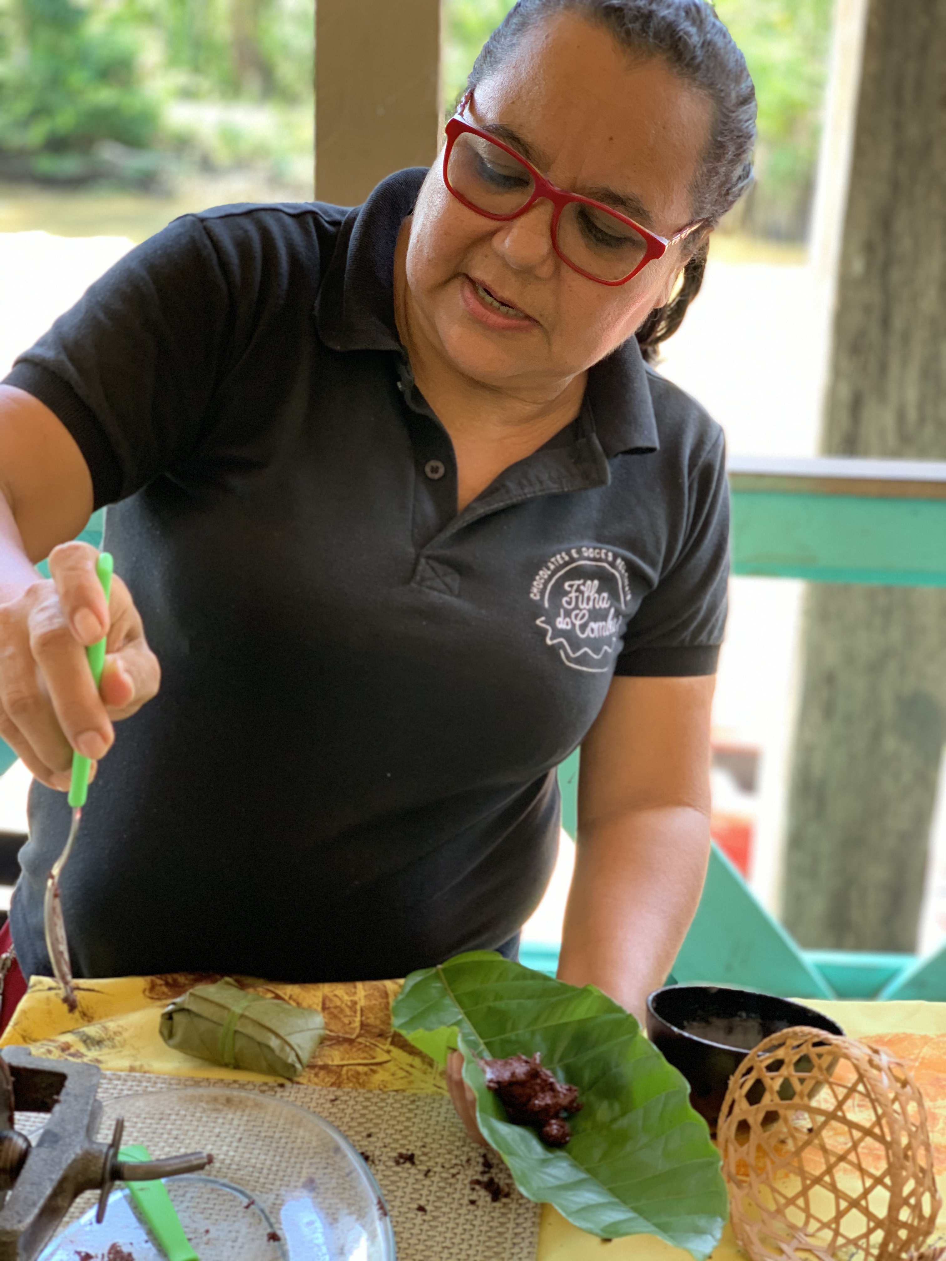 O Pará produz 90% de todo o açaí consumido no mundo, o que é impressionante. Mas mais surpresa ainda fiquei ao saber que o estado é líder nacional na produção de cacau. Pois é, apesar de não reconhecido, o Pará tem cacau dos bons, como o lá da Ilha do Combu. Desses, o mais famoso é o cacau feito artesanalmente pela dona Nena. Ela usa o fruto selvagem do próprio quintal, que cresce à sombra de samaúmas, castanheiras e pés de cupuaçu. Quem estiver em Belém vale a pena atravessar o rio Guamá até a ilha para conhecer um pouco do projeto. A própria dona Nena nos recebeu e contou a trajetória da família, desde a falta de apoio no início do projeto até o reconhecimento como referência em negócios sustentáveis. Eles fazem do zero — colheita, fermentação, torra — uma massa de cacau bruto, vendido em barra, que é o grande símbolo dessa história. Há alguns anos, dona Nena queria aprender a refinar o cacau que produziam para fazer bombons e vender em feiras na cidade. Para isso, chamou o chef Thiago Castanho, dos ótimos Remando do Peixe e Remanso do Bosque, para ensiná-la. Mas, surpreso com a qualidade do produto, em vez de ensiná-la o processo de refinamento, ele a fez ver que o grande trunfo estava justamente naquela barra de cacau rústica, sem processamento. E é esse cacau que vem ganhando destaque país afora, nos cardápio de restaurantes de chefs como o próprio Thiago, Alex Atala, Roberta Sudbrack. Hoje a dona Nena está aumentando a fábrica ao lado de casa e já vende também outros produtos, como chocolates em barra, nibs de cacau, geleia de cupuaçu e a típica cachaça com jambu.
