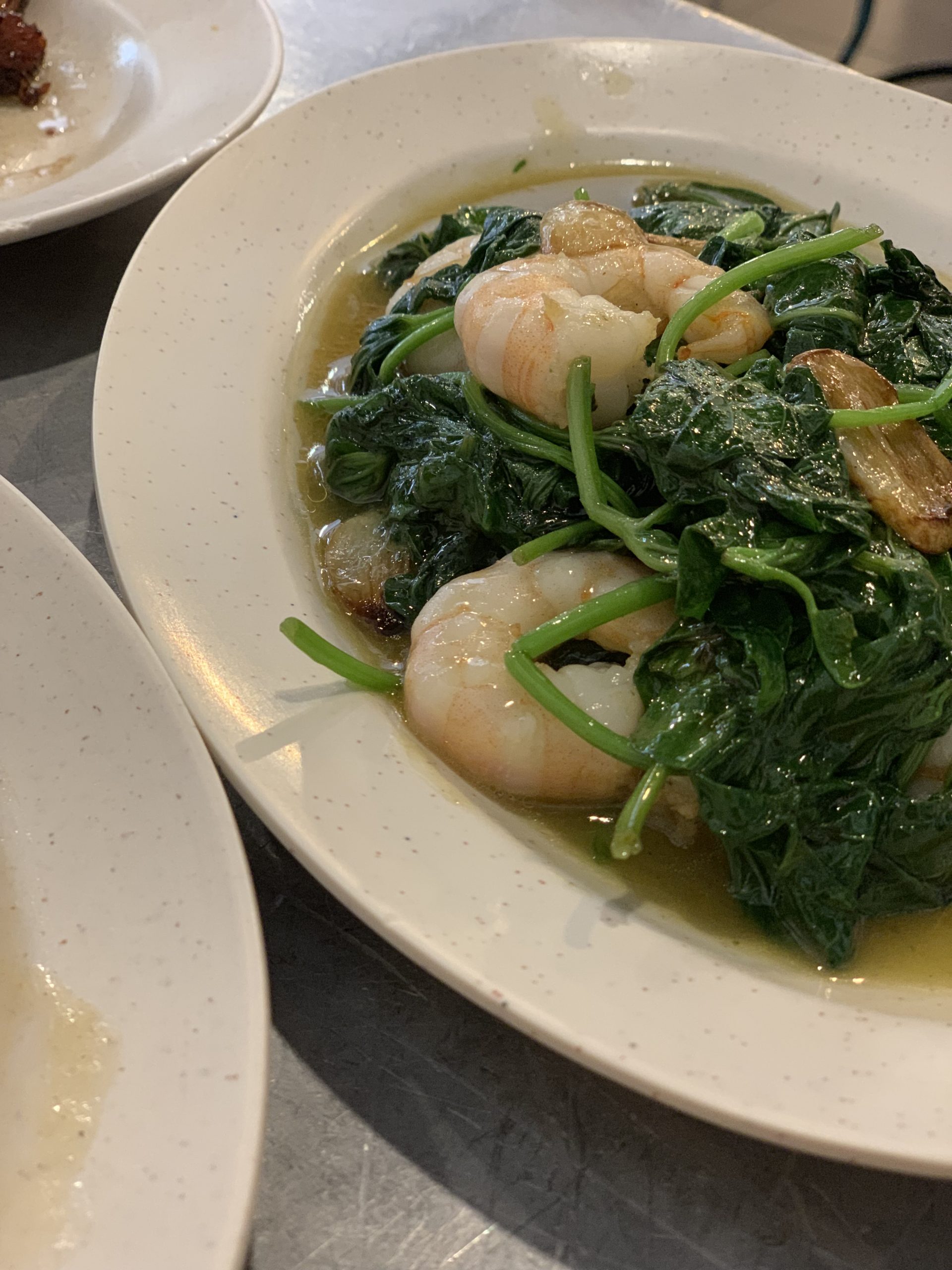 - Ramas de batata-doce com sambal (molho de pimenta) e camarões, prato delicioso do Tek Sen