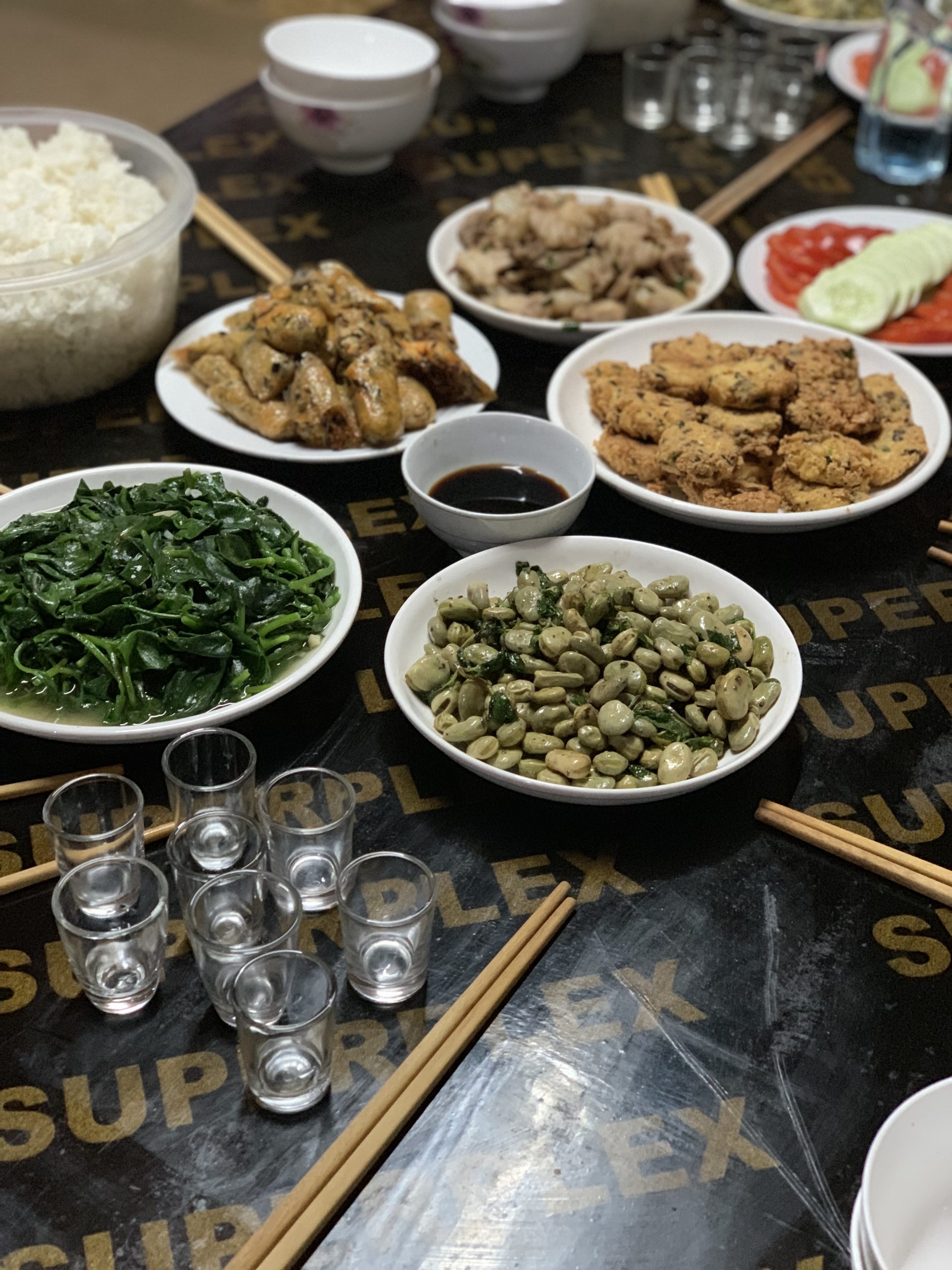 Dias depois, já no norte do Vietnã, numa comunidade bem pequena entre montanhas, vales e arrozais, há uns 10 quilômetros da fronteira com a China, comemos de novo as ramas de batata-doce, que agora eu já conseguia identificar. Desta vez, foi na casa de uma família da etnia Hmong. O Su, cozinheiro da casa, preparou um banquete para a gente, com direito a rolinho vietnamita frito recheado com verduras, noodles e cogumelos, feijão verde salteado e delicioso, tofu com tomates e um prato típico da minoria étnica deles, o momong, feito de milho vermelho socado até virar fubá, cozido no vapor, peneirado e então servido com um caldo claro de legumes. É muito reconfortante. Su fez as ramas de batata-doce de um jeito diferente e igualmente delicioso: refogadas com alho e um pouco de shoyu, um jeito bem tradicional de refogar folhas por lá. E é assim que eu adotei aqui em casa.
