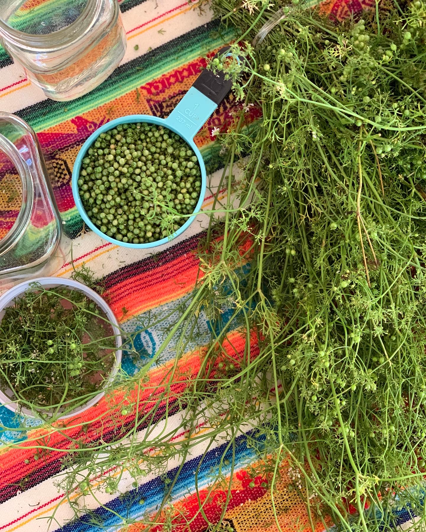 Como geralmente compro maços e maços de semente fresca de coentro quando acho na feira, não consigo dar conta de tudo de uma vez só. Uma parte uso fresca, outra deixo secar — um pouco para plantar e outro tanto para usar como especiaria, par perfeito do cominho. Mas também adoro fermentar os grãos frescos para conservá-los por mais tempo — e ganhar um novo sabor. Eles desenvolvem uma acidez mais complexa que finaliza bem qualquer prato com peixes e frutos do mar, além de arrozes, relishes e molhos. Fazer é simples e vale por uma terapia: só precisa de um pouco de tempo e sossego para debulhar as sementes. Depois disso, é pá-pum: misture a salmoura e deixe fermentar. O tempo de fermentação é variável (quanto mais calor, por exemplo, mais rápido fermenta), mas, em geral, eu deixo entre 4 e 7 dias fora da geladeira e depois refrigero e vou consumindo aos poucos, dura uma eternidade.