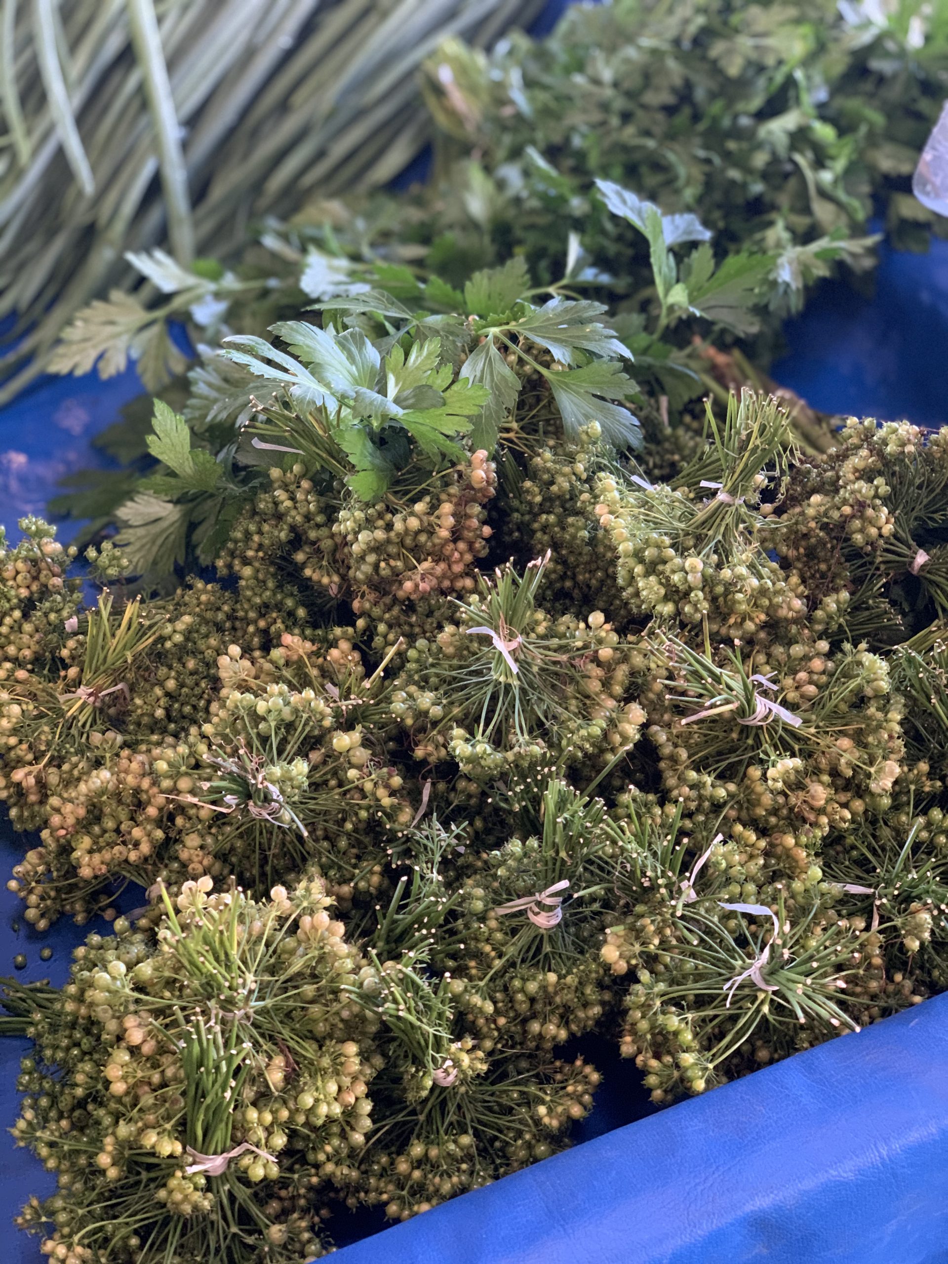 Essa parte de Minas já é bem “baianeira”. Digo, é onde Minas encontra a Bahia e nos enche de sabores próprios da mistura tão boa. Tem fubá, quiabo, maxixe, chuchu de vento, arroz de pilão, rapadura, farinha de mandioca da fina e da grossa e também a de milho, flocada e bem torrada. Tem colorau, pimenta arretada e de cheiro, amendoim, abóbora caipira, feijão preto e de corda. E tem, meu caro, uma das “especiarias” mais incríveis do meu mundo tropical: a semente fresca de coentro. Ah, meus olhos nem acreditavam naquela cena — dezenas de minibuquês de sementes de coentro amarradinhos e vendidos como um item qualquer do sabor local. É por isso que amo andar de feira em feira colecionando “achados” para a minha coleção de memoráveis de cada viagem — menos souvernirs, mais experiências.