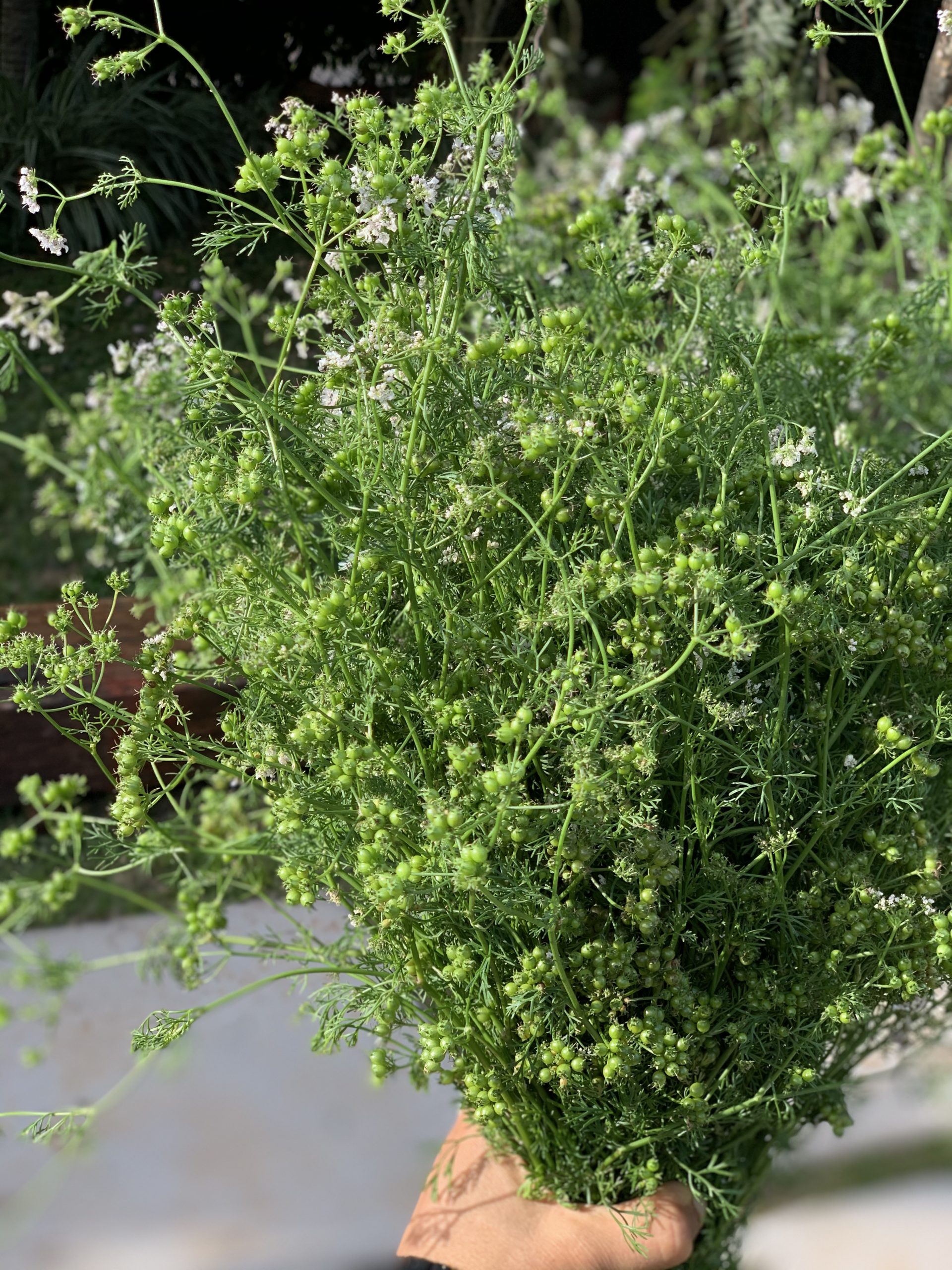 Claro que quis saber como eles usam a semente de coentro verde lá no norte de Minas e a resposta foi unânime: socada no pilão com alho. Para tudo: refogar o feijão, a verdura, o frango da roça. Sabidos eles. Eu gosto muito de usá-las com peixes e frutos do mar, em moquecas (na moquequinha de siri é um sucesso), em curries e até no ceviche, que fica bem refrescante. São ótimas também em molhos (experimente no pesto), marinadas, vinagretes e conservas. A gremolata (aquele tempero italiano com salsinha, alho e sal) com sementes de coentro frescas e raspas de limão fica outra coisa.