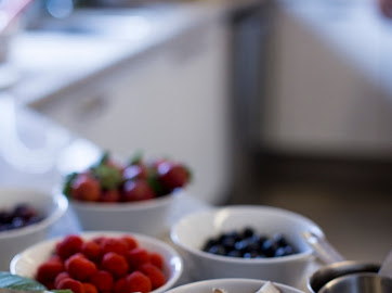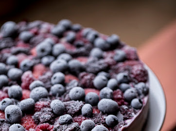 A primeira vez que a fiz em um aniversário meu, há uns 5 anos, foi com cobertura de manga e gengibre, bem tropical, doce e com um ardidinho bom. Eu adoro essa combinação, que é bem a cara do nosso verão. Um pouco de damasco nessa mistura também fica bom. Antes disso, na primeira vez mesmo que testei a receita, num jantar para amigos, a cobertura foi de fisális, framboesas, pistache e pedacinhos de chocolate amargo salpicados. Outras boas ideias para a cobertura são goiabada cascão dissolvida em um pouquinho de água e com umas gotas de limão; geleias caseiras de frutas; raspas de limão; ganache de chocolate (que pode ser feita com chocolate meio amargo em barra derretido em banho-maria mais um pouco de leite de amêndoa); e frutas frescas cortadas, como figos e mangas bem suculentas. Aliás, na foto aqui, eu congelei as frutas vermelhas com a torta. Nesse caso, é bom tirar a torta do congelador uns 20 a 30 minutos antes de servir, para dar tempo de as frutas descongelarem um pouco. Funciona também afundar um pouco as frutas no creme para não congelarem tanto. Mas hoje, muitas vezes, só acrescento as frutas na hora de servir. O morango, por exemplo, como tem muita água, demora a descongelar.